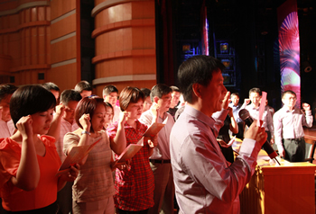五年新跨越 歌聲獻(xiàn)給黨 ----集團(tuán)隆重舉行“七一”總結(jié)表彰大會(huì)暨文藝匯演活動(dòng) 6月30日下午,產(chǎn)控集團(tuán)召開“七一”紀(jì)念表彰大會(huì)暨大型文藝匯演活動(dòng)。集團(tuán)所屬20家黨組織、近千名黨員參加活動(dòng),回顧黨的光輝歷程和“十一五”發(fā)展成果,以昂揚(yáng)的歌聲表達(dá)對(duì)黨的熱愛。市國資委李桂順主任、市委組織部宋建宏處長應(yīng)邀出席,集團(tuán)黨委副書記徐憲華主持大會(huì)。 大會(huì)表彰了2010年度“五好”黨組織、優(yōu)秀黨員和優(yōu)秀黨務(wù)工作者,以及在“創(chuàng)先爭(zhēng)優(yōu),實(shí)現(xiàn)跨越發(fā)展”暨慶祝建黨90周年系列活動(dòng)中涌現(xiàn)的先進(jìn)集體和個(gè)人。全系統(tǒng)20多名新黨員面向黨旗進(jìn)行入黨宣誓,與會(huì)黨員重溫了誓詞。 集團(tuán)黨委書記、董事長陳照東代表黨委作報(bào)告。他指出,全市經(jīng)濟(jì)社會(huì)發(fā)展已進(jìn)入“兩個(gè)率先”的關(guān)鍵時(shí)期,產(chǎn)業(yè)現(xiàn)代化是市委確定的三大目標(biāo)之一,產(chǎn)控集團(tuán)要成為產(chǎn)業(yè)現(xiàn)代化的生力軍。他要求,圍繞“十二五”期末實(shí)現(xiàn)總資產(chǎn)、銷售額“雙兩百億”的目標(biāo),各級(jí)黨組織要引領(lǐng)科學(xué)發(fā)展,統(tǒng)籌謀劃發(fā)展思路、發(fā)展戰(zhàn)略,重點(diǎn)加 快洋口港新城、觀音山新城和生物科技園的新興產(chǎn)業(yè)建設(shè)和傳統(tǒng)產(chǎn)業(yè)的優(yōu)化升級(jí);全體黨員要爭(zhēng)做先鋒模范,以企為家,立足崗位,創(chuàng)新、敬業(yè)、奉獻(xiàn);通過建設(shè)學(xué)習(xí)型黨組織,加強(qiáng)人才引進(jìn)和培養(yǎng),積極推進(jìn)民主管理,加強(qiáng)反腐倡廉建設(shè),以創(chuàng)先爭(zhēng)優(yōu)為主題創(chuàng)新黨建工作內(nèi)涵,圍繞深化改革、加快發(fā)展、維護(hù)穩(wěn)定的大局提供 堅(jiān)強(qiáng)的政治和組織保障,為集團(tuán)實(shí)現(xiàn)新的跨越保駕護(hù)航。 大會(huì)在雄壯的《國際歌》歌聲中結(jié)束。會(huì)后,以“黨旗輝映產(chǎn)控情”為主題的大型文藝匯演隆重上演,產(chǎn)控系統(tǒng)十家單位選送了精彩的歌舞、小品、詩朗誦等節(jié)目,贏得陣陣喝彩,向社會(huì)展現(xiàn)了產(chǎn)控人“齊心向黨、追求跨越”的嶄新風(fēng)貌。