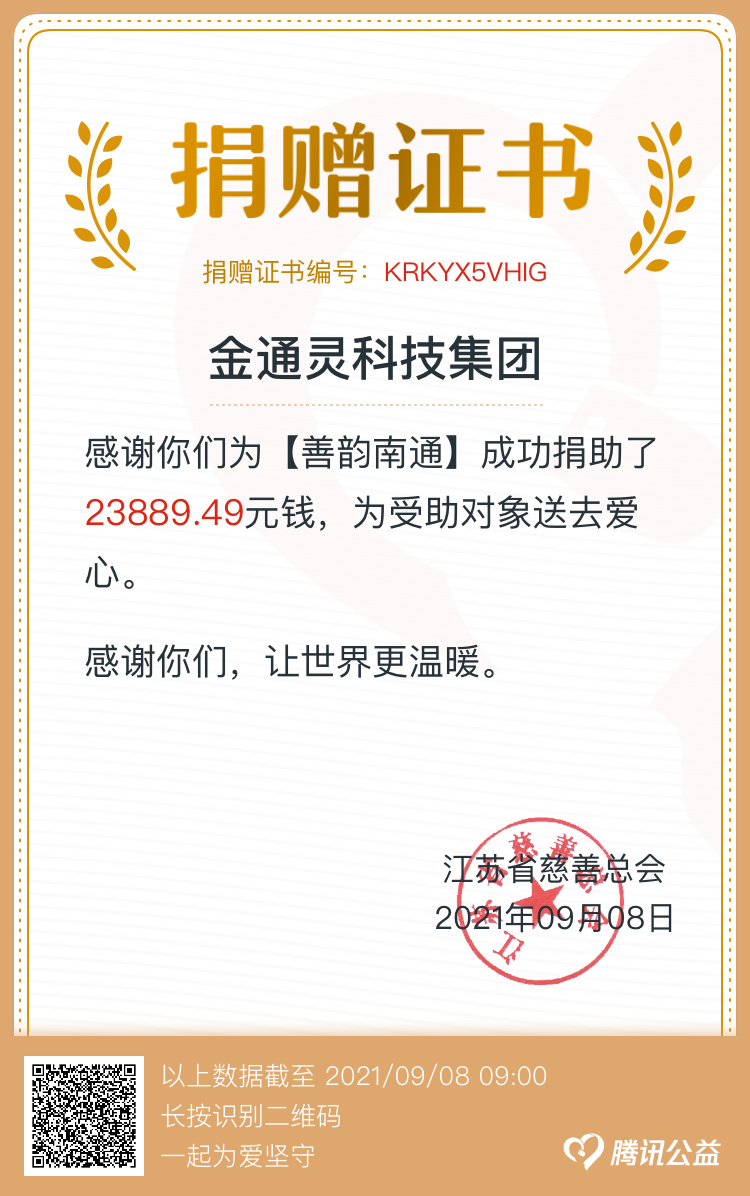 近日,我市組織開展“博愛在南通 慈善暖江?!?span>慈善一日捐活動,金通靈積極響應(yīng)產(chǎn)控集團的號召,第一時間組織開展一日捐活動。截止到9月8日,金通靈共籌得善款23889.49元,募集資金將統(tǒng)一交至南通市慈善總會,繼續(xù)用于扶貧、慈善救助項目。