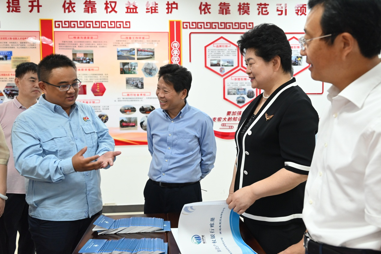 公司董事長、總經(jīng)理袁擁軍代表公司全體員工對蔡毅德一行表示熱烈的歡迎,并陪同參觀了公司黨群活動室、產(chǎn)改工作室,詳細(xì)介紹了在公司“五彩黨建”引領(lǐng)下,以“五個依靠、五心工程”為抓手開展的一系列產(chǎn)改工作。袁擁軍匯報了公司近年來在黨建工作、生產(chǎn)經(jīng)營、科技創(chuàng)新、人才培養(yǎng)、產(chǎn)業(yè)工人改革等方面取得的優(yōu)異成績。調(diào)研過程中,來訪人員饒有興趣的了解了公司 “員工幸福計劃”、“知識產(chǎn)權(quán)銀行”制度、“青藍工程”等亮點工作和做法,并給予高度肯定。袁擁軍向來訪人員贈送了由公司黨員和管理骨干開展讀書征文活動編撰的 “單位如家、感恩有我”、“奮斗如歌”、“責(zé)任如磐、攻堅有我”系列叢書。